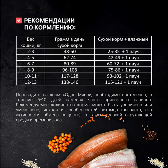 переводить на корм «Одно Мясо», необходимо постепенно, в течение 5-10 дней заменяя часть привычного рациона. Рекомендуемое количество корма может быть увеличено или уменьшено, исходя из особенностей питомца (возраста, его активности, обмена веществ), а также условий окружающей среды и времени года.