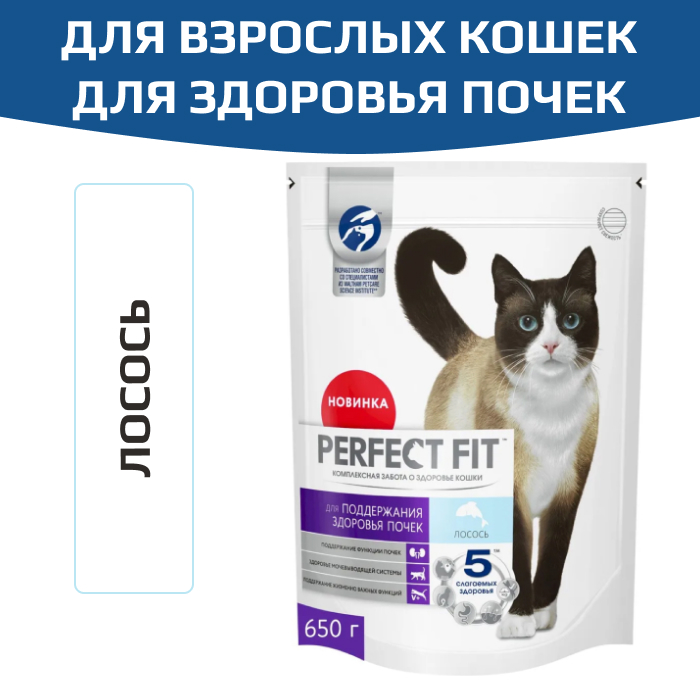 Сухой рацион PERFECT FIT™ "Здоровье почек" для взрослых кошек с лососем разработан специально для поддержания здоровья почек кошек.