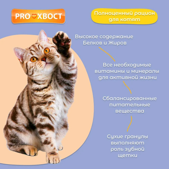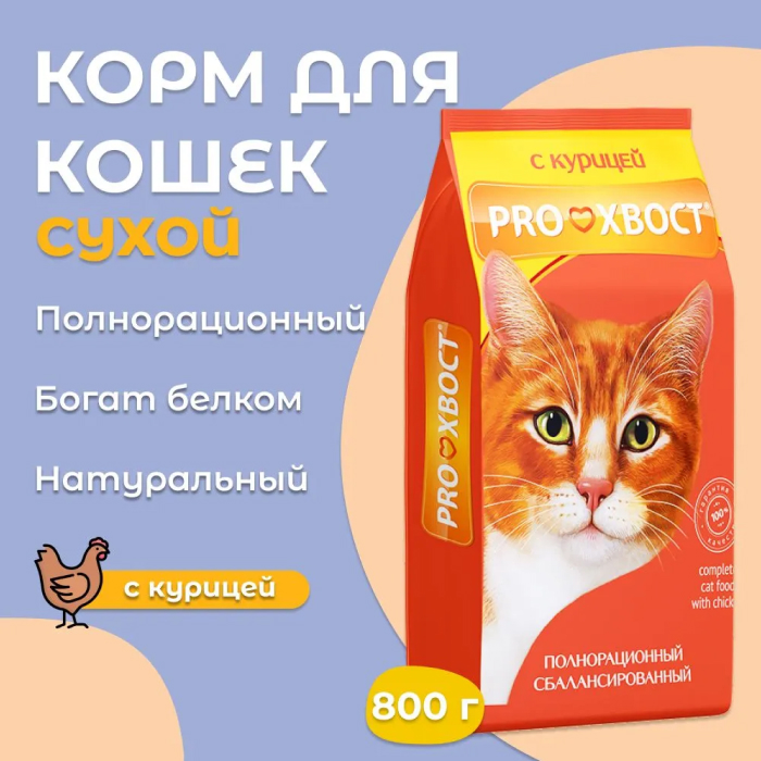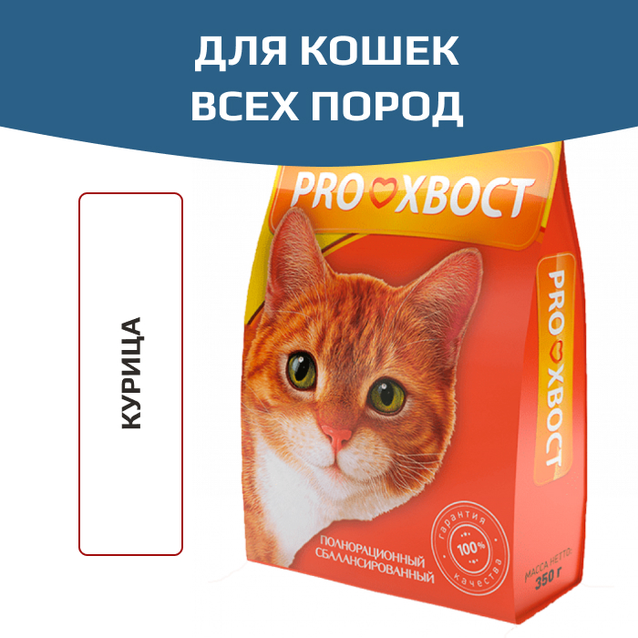 Сухой корм Proхвост (Прохвост) с курицей разработали датские специалисты по кормлению животных. В рецепт вошли натуральные продукты: мясо, злаки и овощи. Они в обязательном порядке должны присутствовать в ежедневном рационе кошки, так как от них зависит здоровье и активность. В отличие от еды со стола человека в корме соблюден правильный баланс питательных элементов, витаминов и минералов. В сухом рационе их ровно столько, сколько требуется организму кошки.