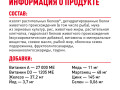 Витамин A: 27000 ME, Витамин Д3: 1205 ME, Железо: 37,2 мг, Йод: 3,7 мг, Медь: 11 мг, Марганец: 48 мг, Цинк: 145 мг, Селен: 0,06 мг Технологические добавки: Клиноптилолит осадочного происхождения: 10 г, Консерванты – Антиокислители. Белки: 38 % - Жиры: 15 % - Зола: 7,8 % - Клетчатка пищевая: 3,3 %