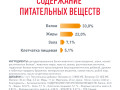 Белки: 33 % - Жиры: 22 % - Минеральные вещества: 6,9 % - Клетчатка общая: 5 %