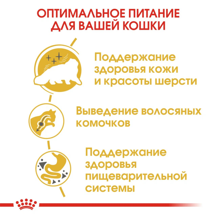 Персидские кошки глотают немало шерсти во время ежедневного вылизывания. Непрерывный процесс линьки усугубляется домашним образом жизни. Особое сочетание различных видов клетчатки (включая семена подорожника Psyllium, богатые растительной слизью) естественным образом стимулирует кишечный транзит, способствуя выведению проглоченной шерсти и сокращая образование волосяных комочков.