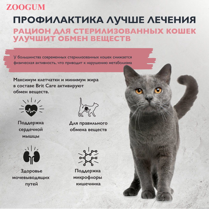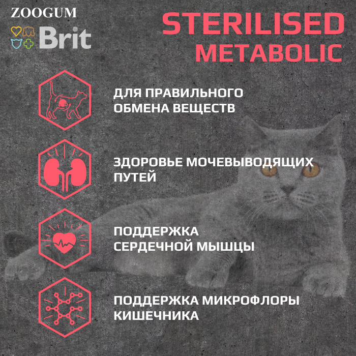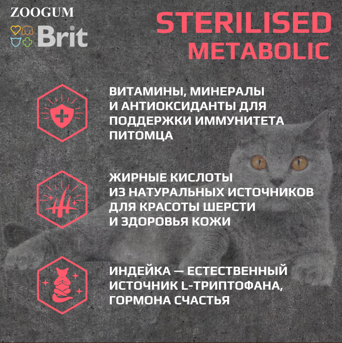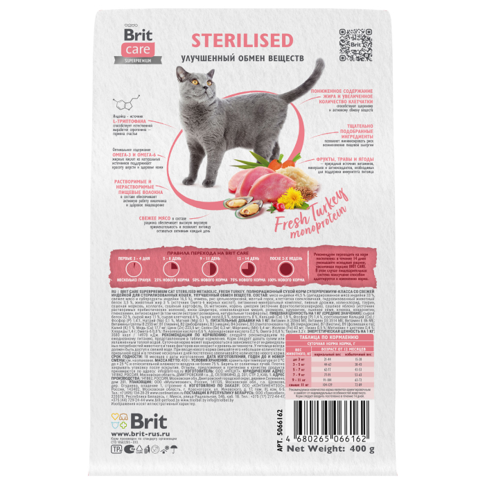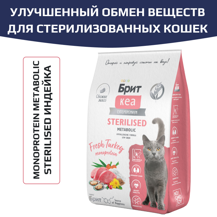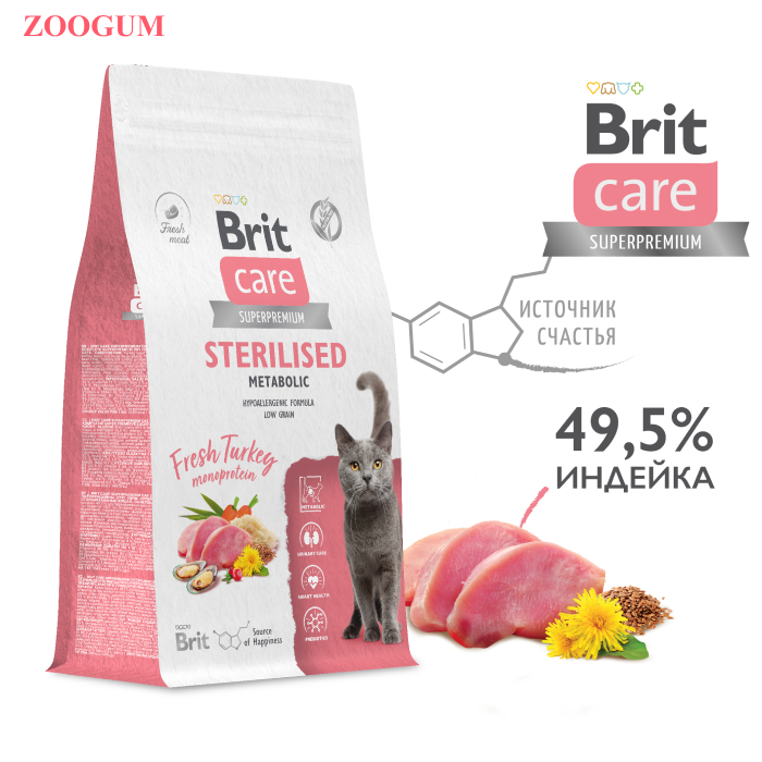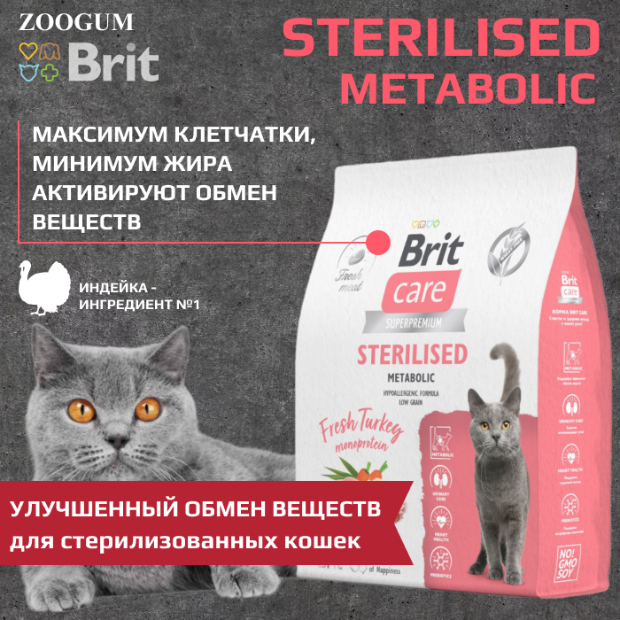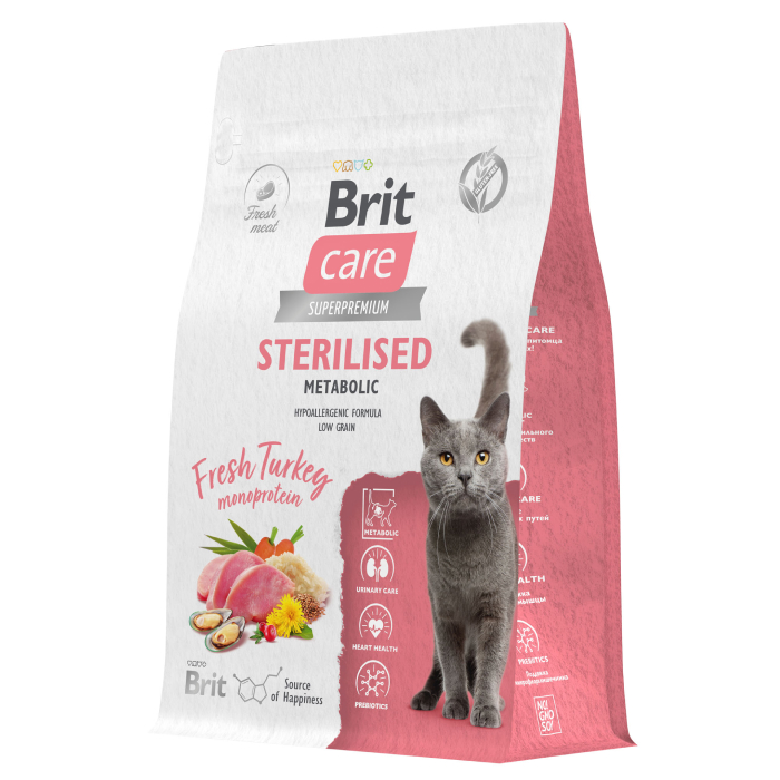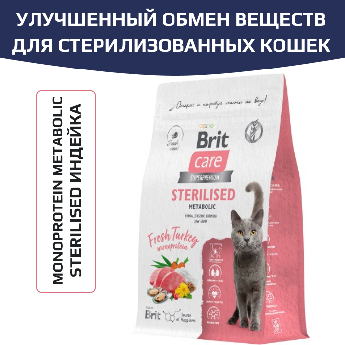 Brit Care Cat Sterilised MONOPROTEIN Metabolic корм сухой для стерилизованных кошек, улучшенный обмен веществ, с индейкой.