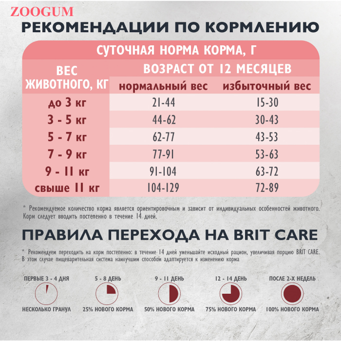 сырой белок 32 %, сырой жир 11 %, сырая клетчатка 4 %, сырая зола 8,5 %, влажность 8 %, Кальций (Са) 1,9 %, Фосфор (Р) 1,4 %, соотношение Кальций (Са) / Фосфор (Р) 1,4:1, Натрий (Na) 0,1 %, Магний (Mg) 0,1 %. Питательные добавки на 1 кг: Витамин A 20560 МЕ; Витамин D3 3514 МЕ; Витамин E 86 МЕ; Витамины группы В 2555 мг: В1 (тиамин), В2 (рибофлавин), В3 (ниацин), В4 (холин), В5 (пантотеновая к-та), В6 (пиридоксин), В7 (биотин), В9 (фолиевая к-та); Калий (K) 1 %; Медь (Cu) 17,7 мг; Цинк (Zn) 223,5 мг; Селен (Se) 0,3 мг; Марганец (Mn) 5,4 мг; Железо (Fe) 83 мг; Лизин 0,5 %; Метионин + цистеин 0,4 %; Хлориды 1,4 г; Омега-6 0,8 %: Линолевая кислота 0,6 %, Арахидоновая кислота 0,2 %; Омега-3 0,8 %; Таурин 3,2 г. Энергетическая ценность на 1 кг: 3580 ккал / 14978 кДж.
