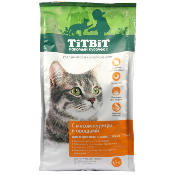 TiTBiT корм сухой для взрослых кошек с курицей и овощами.
