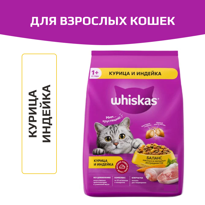 Whiskas корм сухой для взрослых кошек вкусные подушечки с нежным паштетом. Аппетитное ассорти с курицей и индейкой.