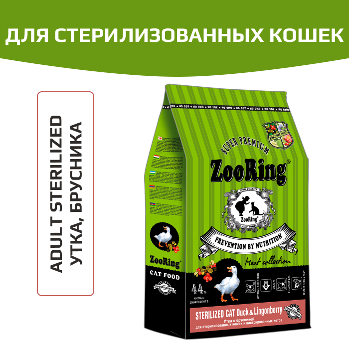 ZooRing STERILIZED CAT Duck&Lingonberry полнорационный сухой корм для стерилизованных кошек и кастрированных котов утка с брусникой.