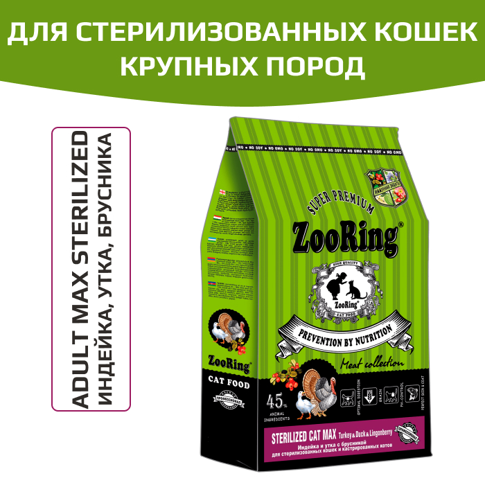 ZooRing STERILIZED CAT MAX TURKEY&DUCK&LINGONBERRY полнорационный сухой корм для стерилизованных кошек и кастрированных котов, особенно подходит питомцам крупных пород индейка и утка с брусникой.