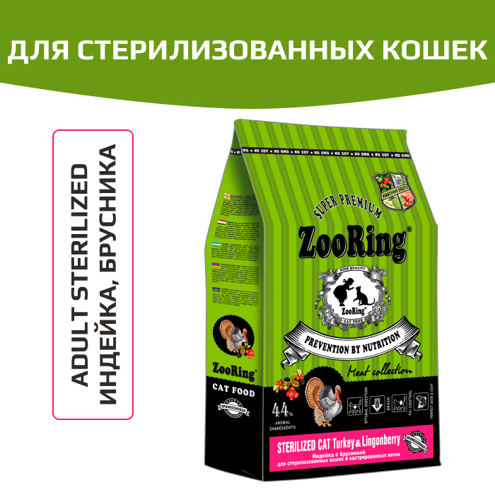 ZooRing STERILIZED CAT TURKEY&LINGONBERRY полнорационный сухой корм для стерилизованных кошек и кастрированных котов индейка с брусникой.