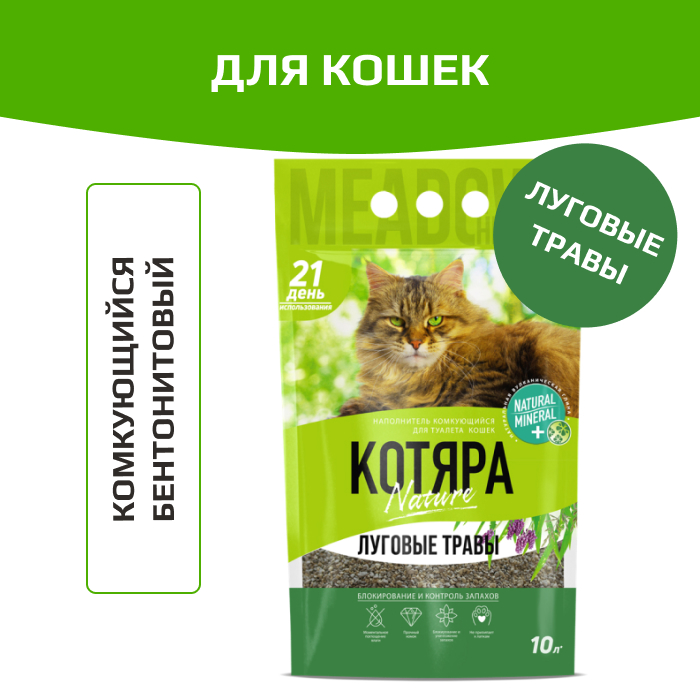 Комкующийся наполнитель КОТЯРА Луговые травы с легким приятным ароматом свежести луговых трав. Полностью натуральный состав на бентонитовых глин естественный и комфортный для кошек.