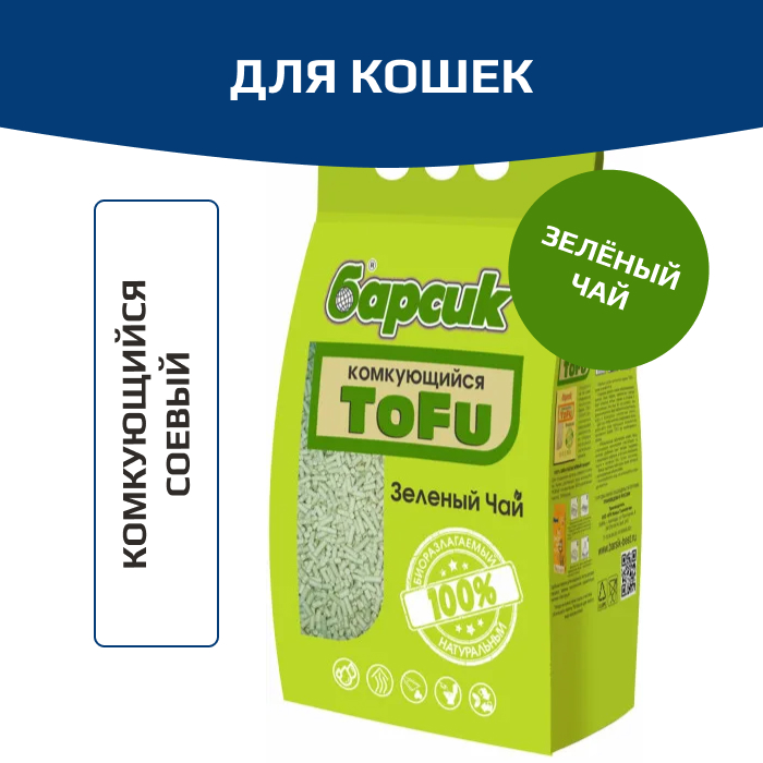 Гигиенический наполнитель Барсик ТОФУ Зеленый Чай – высококачественный натуральный комкующийся наполнитель для кошачьего туалета на основе растительных волокон, с легким приятным ароматом зеленого чая.