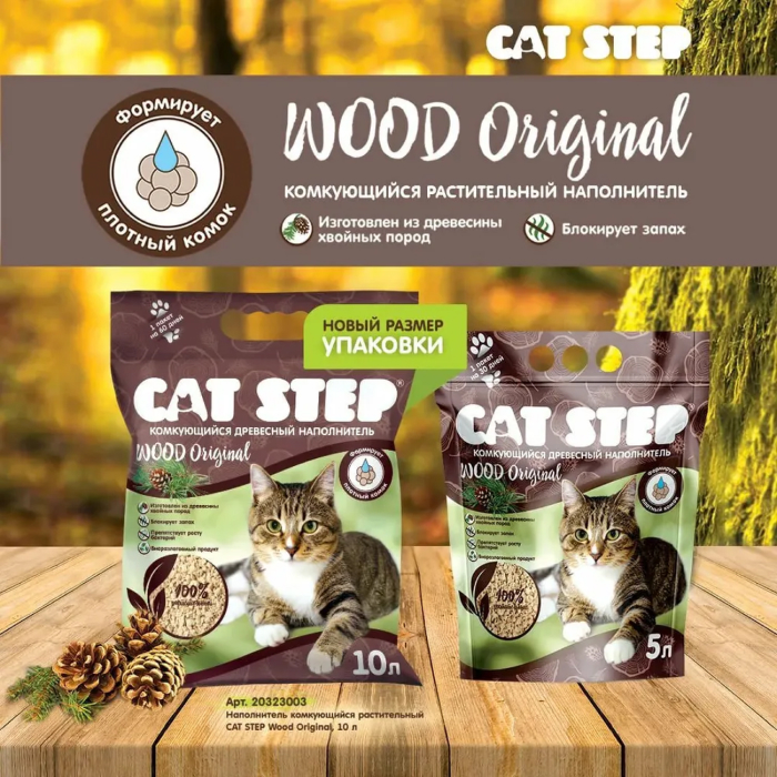 Гранулы древесного наполнителя CAT STEP Wood Original изготовлены из волокон необработанной хвойной древесины. Отсутствие химической обработки гранул гарантирует безопасность продукта для питомца и их хозяев. Благодаря особой структуре гранул жидкость, попадая в наполнитель, не растекается и не застаивается, за счет чего запах надежно блокируется внутри комочков.
