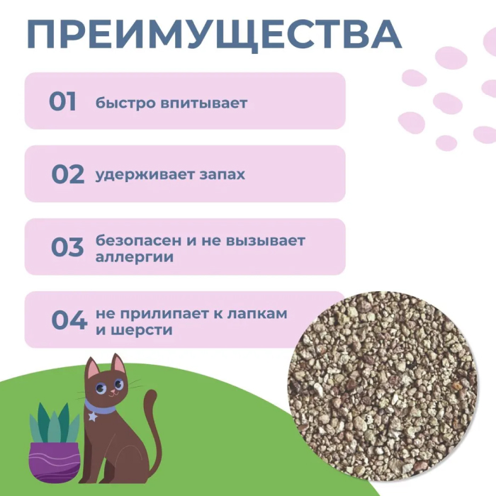 Специальные гранулы напоминают кошке ее естественную среду. Обладает высокой впитывающей и комкующей способностью.
