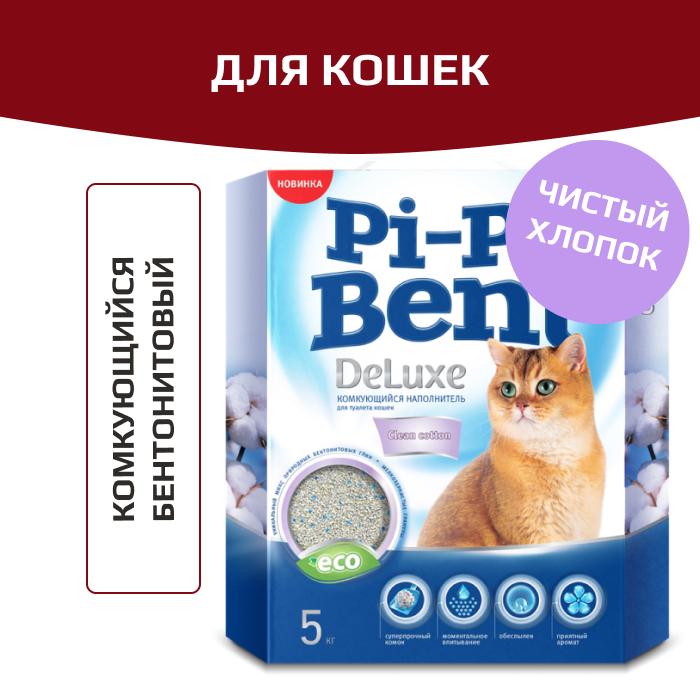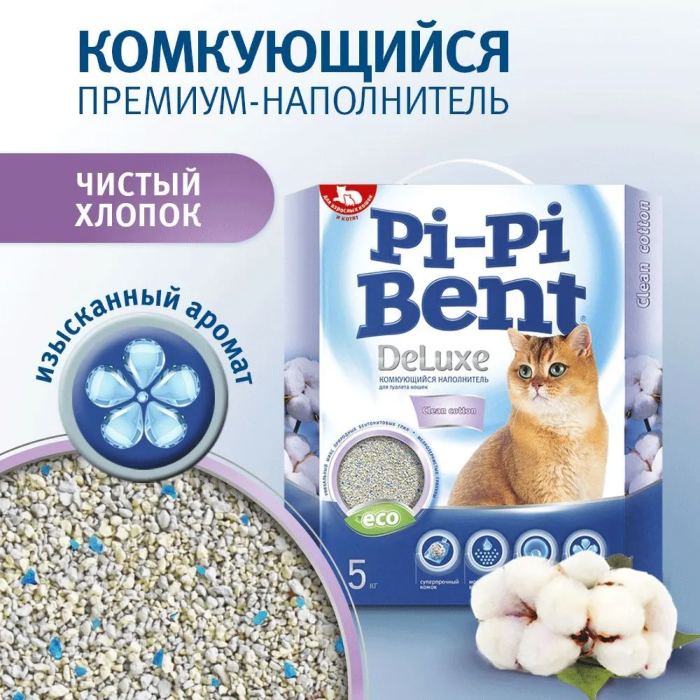 Pi-Pi Bent Deluxe Clean Cotton (чистый хлопок) - комкующийся наполнитель премиум-класса из природной бентонитовой глины. Имеет небольшой размер гранул и понравится всем кошкам, предпочитающим мягкость и особый комфорт при посещении лотка.
