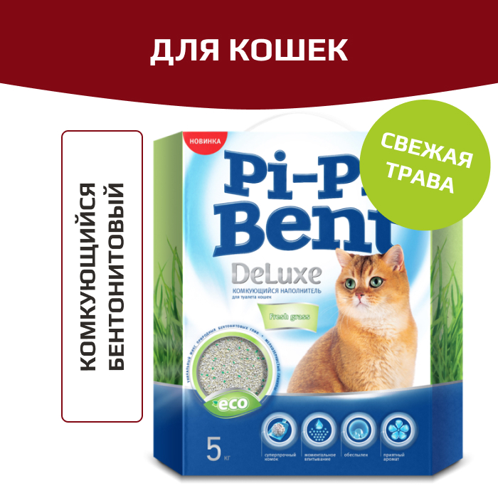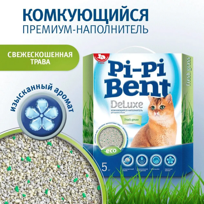 Pi-Pi Bent Deluxe Fresh Grass (свежая трава) - комкующийся наполнитель премиум-класса из природной бентонитовой глины. Имеет небольшой размер гранул и понравится всем кошкам, предпочитающим мягкость и особый комфорт при посещении лотка.