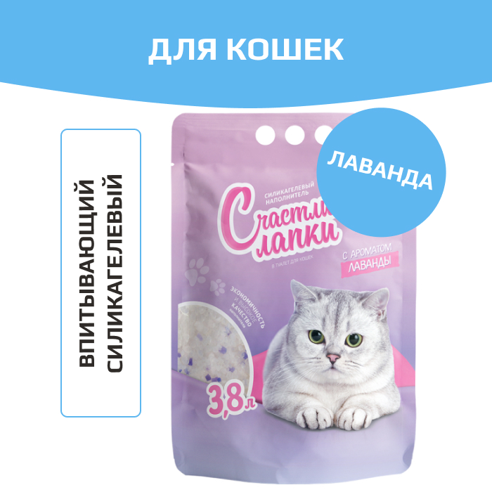 Счастливые лапки силикагелевый с ароматом лаванды наполнитель для кошачьего туалета.