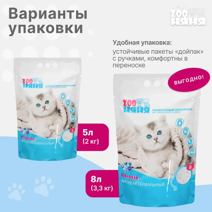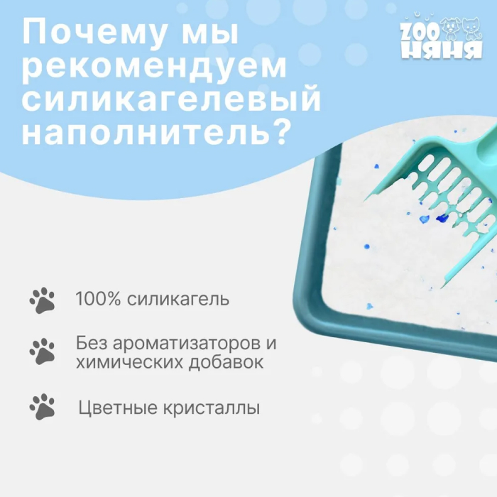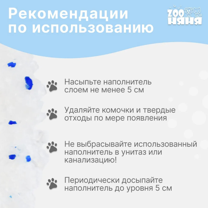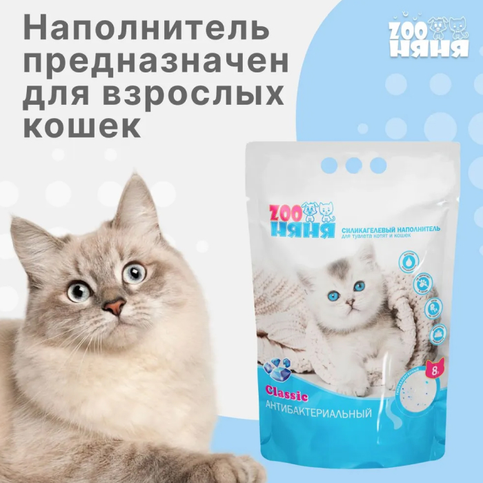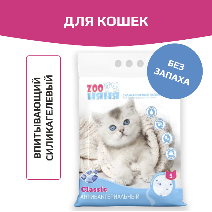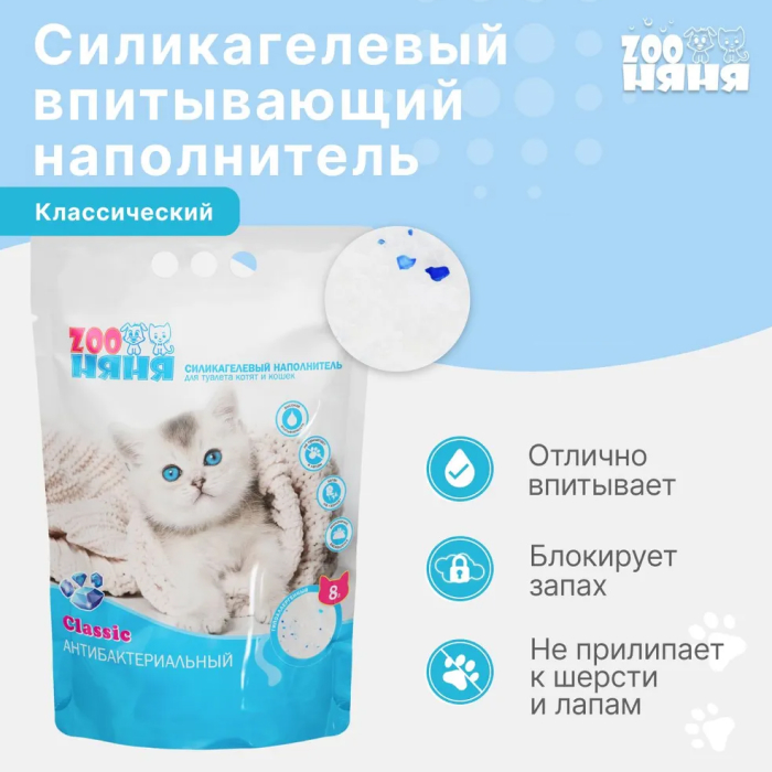 Силикагелевый впитывающий наполнитель «ZooНяня Классик» предназначен для котов, кошек и котят любых пород. Состав - 100% силикагель без красителей, ароматизаторов и химических добавок. НЕ содержит отдушек и красителей и не вызывает аллергии у людей и животных. Не прилипает к шерсти и лапам животных .Моментально впитывает влагу и обеспечивает абсолютную блокировку запаха и препятствует размножению бактерий. 100% биоразлагаемость! Не наносит вреда окружающей среде. Внимание! Не выбрасывать использованный наполнитель в унитаз или канализацию.