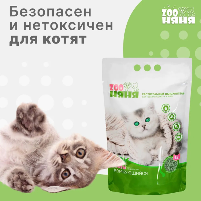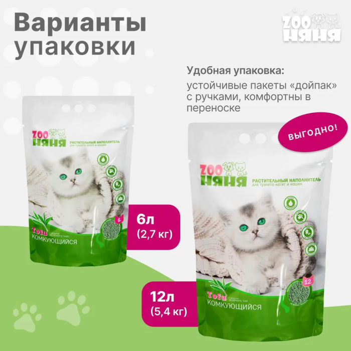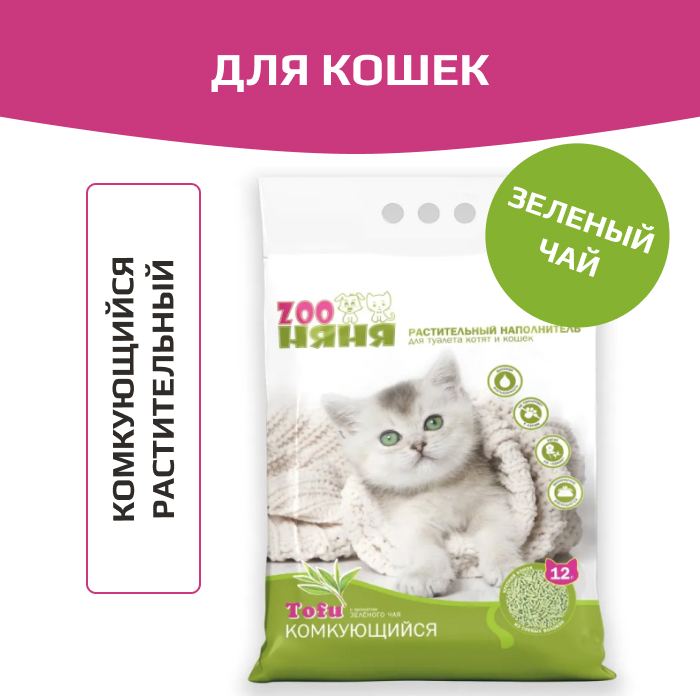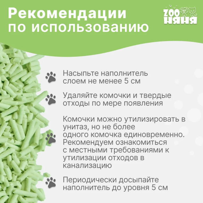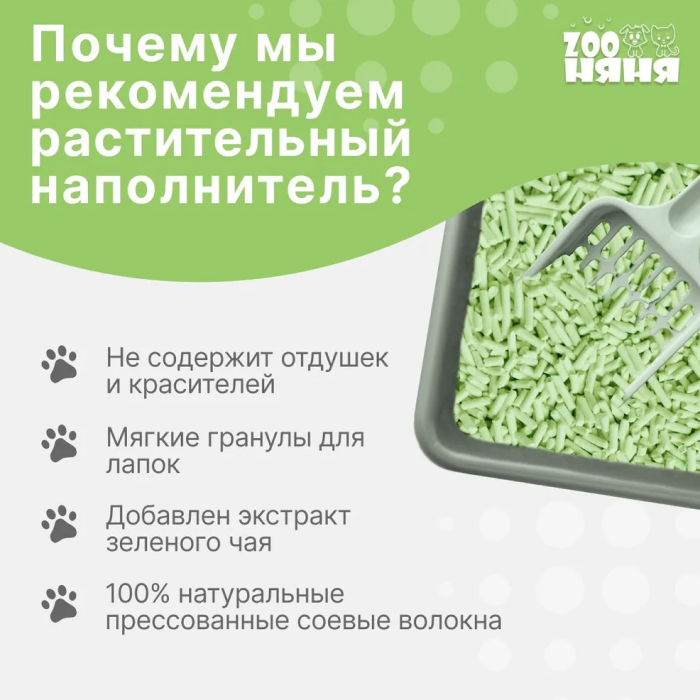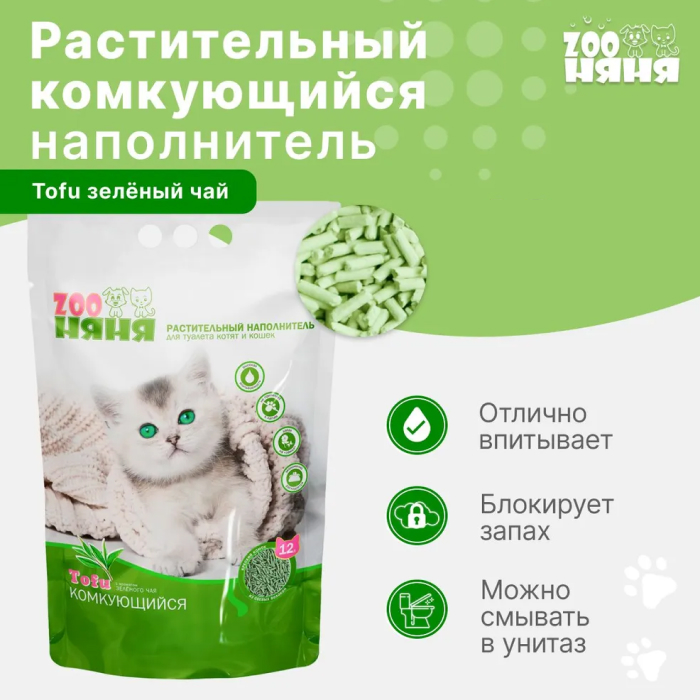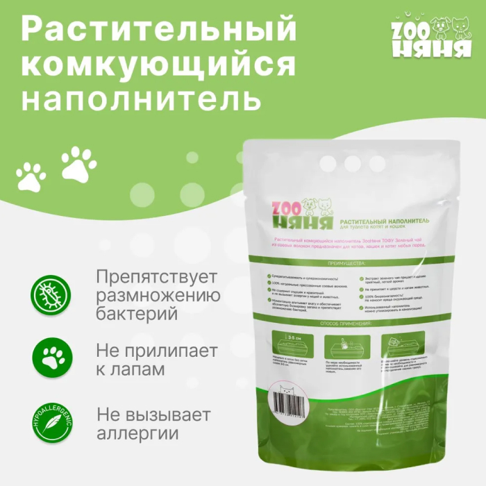 Zoo Няня ТОФУ Зеленый чай наполнитель растительный комкующийся для кошачьего туалета.