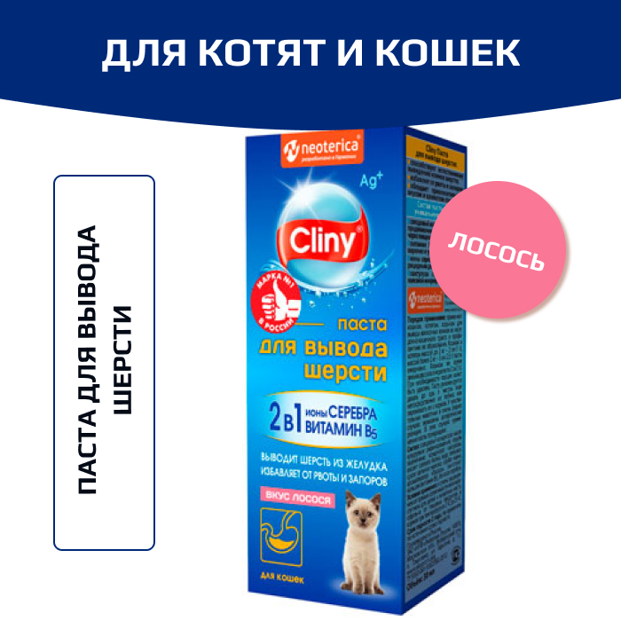 Паста для вывода шерсти Cliny способствует естественному выведению комков шерсти (безоаров) из желудка животных. Избавляет кошек от рвоты, потери аппетита, закупорки кишечника, запоров. Обладает привлекательным для кошек вкусом сыра. Состав пасты имеет уникальную формулу: солодовый экстракт смягчает волосяные комки и облегчает продвижение волосяной массы через пищеварительный тракт; витамин B5 улучшает пищеварение; ионы серебра обладают выраженным дезинфицирующим действием широкого спектра.