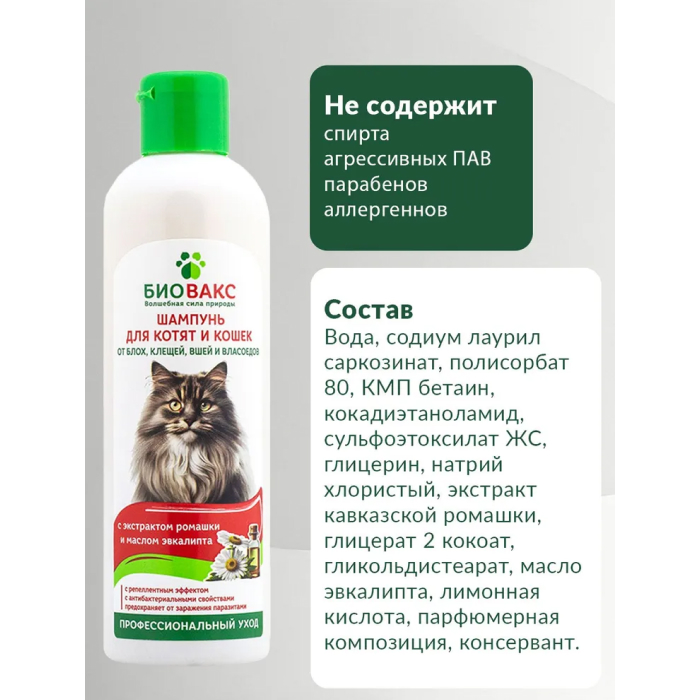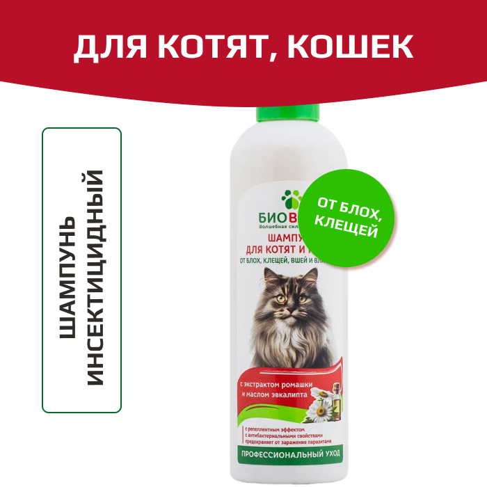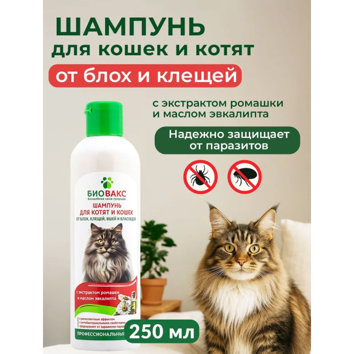БиоВакс Шампунь для кошек от блох, вшей, клещей и власоедов 250мл.