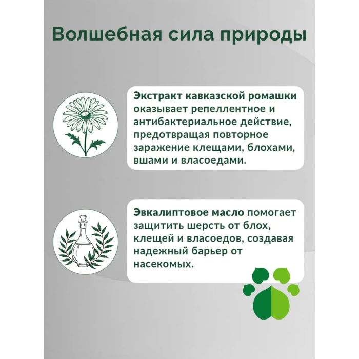 С экстрактом корейской хризантемы и маслом чайного дерева. Добавленный в шампунь ботанический экстракт корейской хризантемы губительно действует в отношении блох и клещей, паразитирующих на кошках, а масло чайного дерева оказывает профилактический эффект против вшей и власоедов.