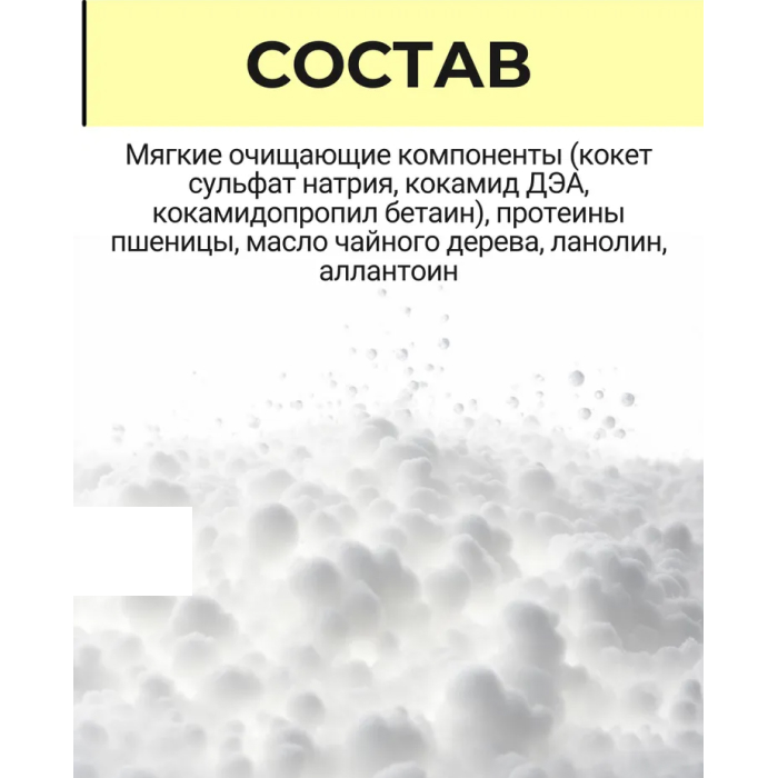 Комплекс мягких ПАВ (лаурет сульфат натрия (SLES), кокамид ДЭА, кокамидопропилбетаин), экстракт крапивы, ланолин водорастворимый, протеины пшеницы, масло чайного дерева, аллантоин