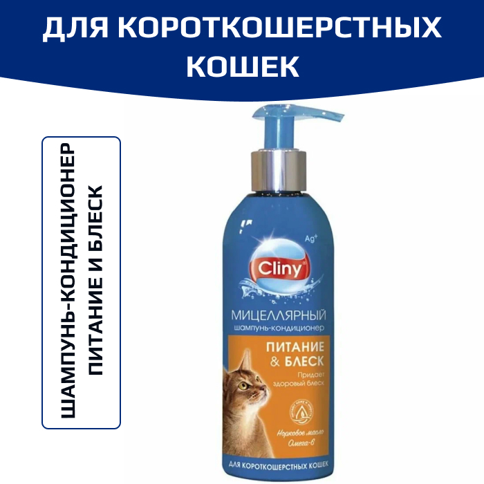 Cliny Шампунь-кондиционер для короткошерстных кошек питает и укрепляет кожно-волосяной покров, придает здоровый блеск и упругость.