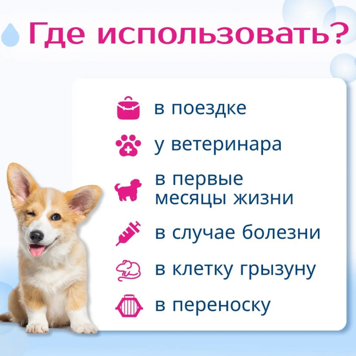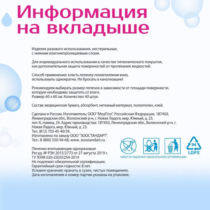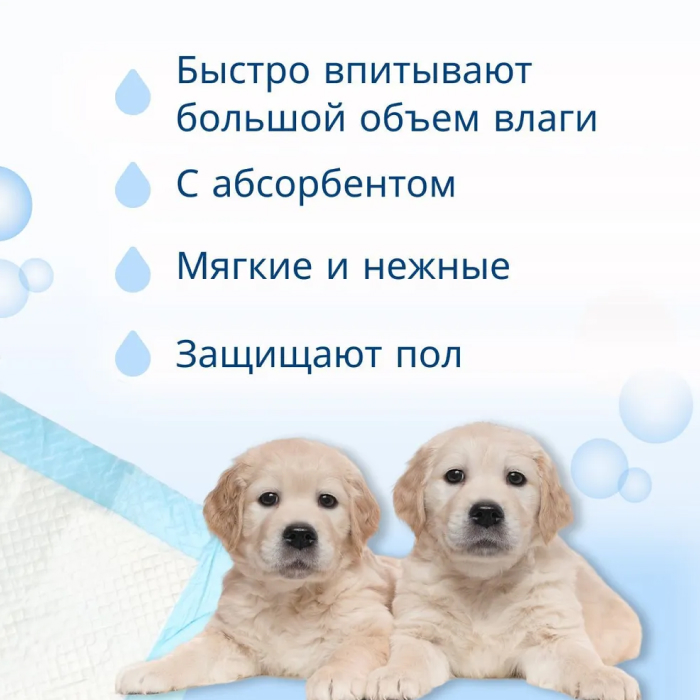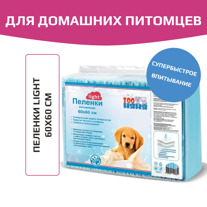 Пеленки впитывающие для ухода за домашними животными ЗООняня Лайт одноразовые гигиенические. Используются при посещении ветеринара, перевозке животных, для защиты пола. Защищает от влаги, слой из полиэтилена предотвращает протекание.