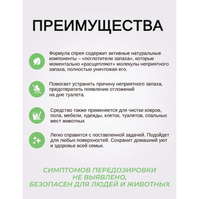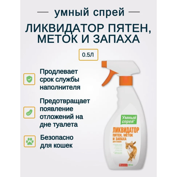 Умный Спрей ликвидатор зпятен, меток и запаха для кошек — средство для нейтрализации неприятных запахов и дезинфекции туалетов кошек и собак декоративных пород. Помогает устранить причину неприятного запаха, предотвратить появление отложений на дне туалета. Средство продлевает срок службы наполнителя в несколько раз!