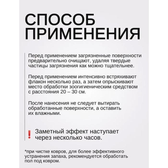 Перед применением загрязненные поверхности предварительно очищают, удаляя твердые частицы загрязнения насколько это возможно. Перед применением интенсивно встряхивают флакон несколько раз, а затем опрыскивают место обработки зоогигиеническим средством с расстояния 20 – 30 см. После нанесения не следует вытирать обработанные поверхности, а оставить их влажными (при чистке ковров, для более эффективного устранения запаха, обработать под коврами). Заметный эффект наступает через несколько часов.