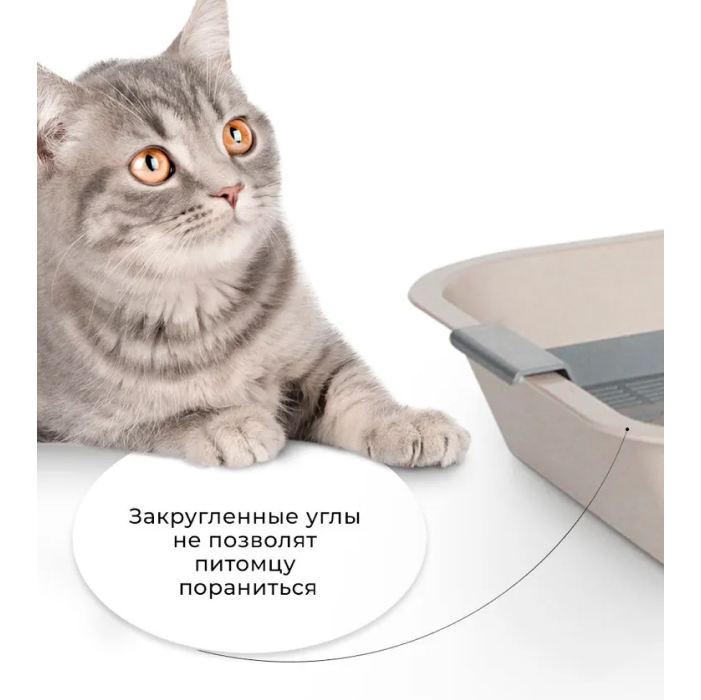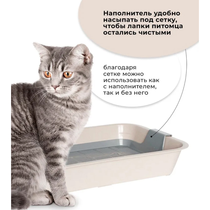 Наличие сетки позволяет использовать лоток как с наполнителем, так и без него. Наполнитель удобно засыпать под сетку, таким образом, лапы у животного будут оставаться чистыми.