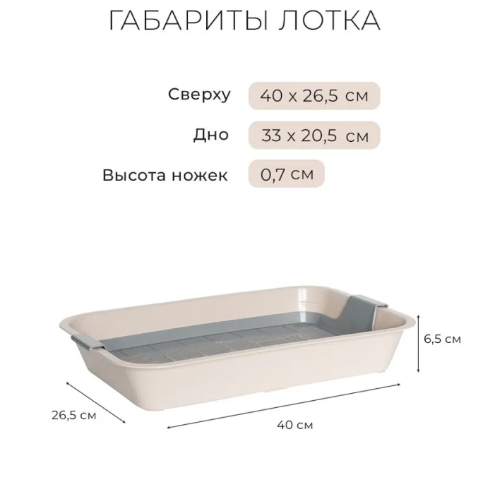 Габариты лотка сверху - 40х26,5 см, дна - 33х20,5 см, высота - 6,5 см.