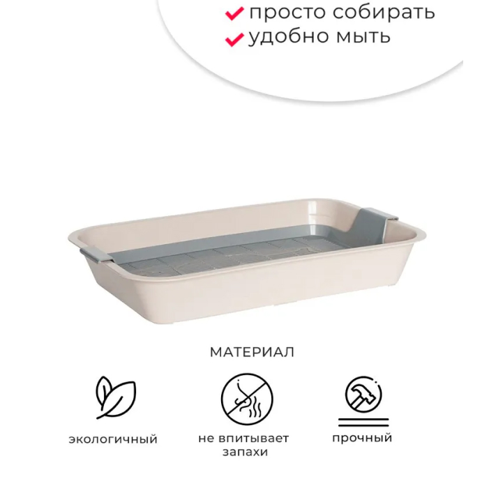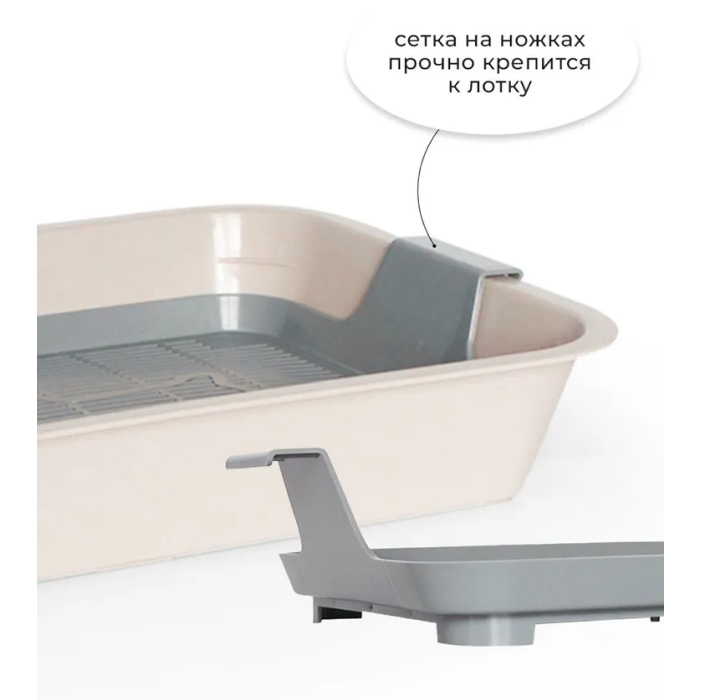 Наличие сетки позволяет использовать лоток как с наполнителем, так и без него. Наполнитель удобно засыпать под сетку, таким образом, лапы у животного будут оставаться чистыми.