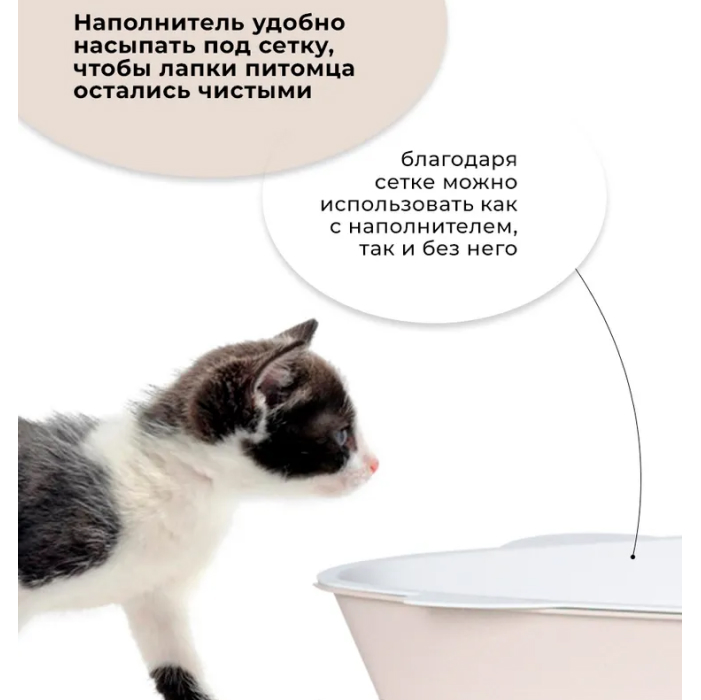 Наполнитель удобно засыпать под сетку, таким образом, лапы у животного будут оставаться чистыми.