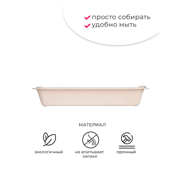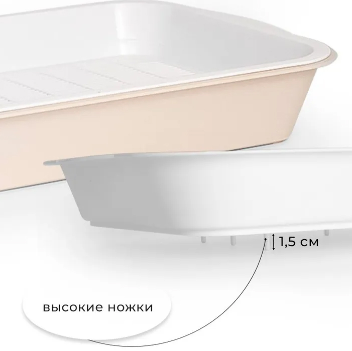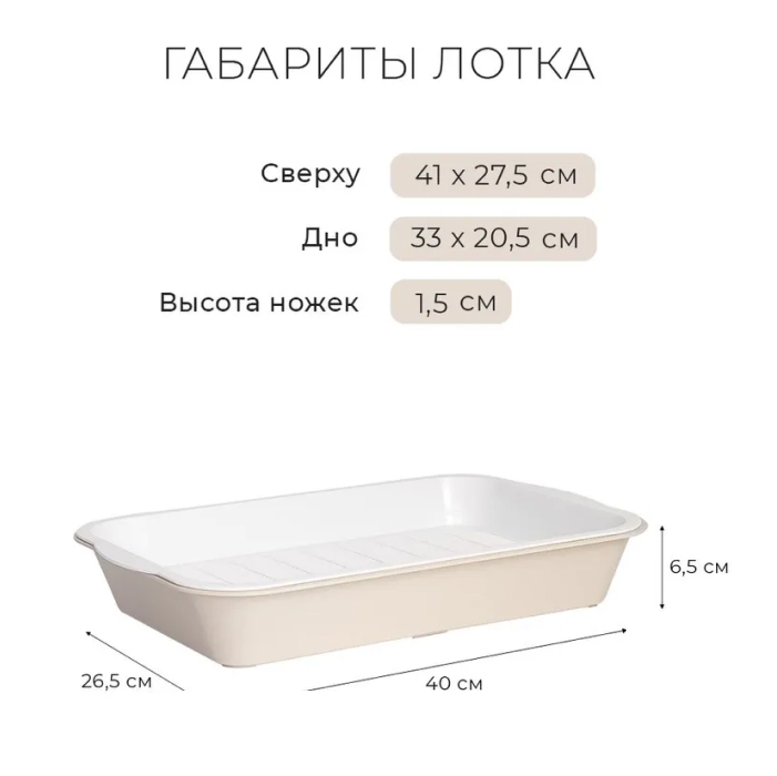В нижней части сетки расположены высокие ножки, на которые эта сетка опирается, так что между лотком и сеткой остается достаточный зазор, так что Вы можете насыпать больше наполнителя. Также это позволяет контролировать количество насыпаемого наполнителя и существенно сокращает его расход.