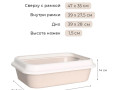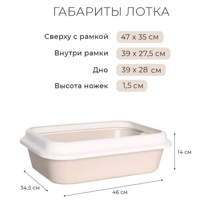 Габариты лотка сверху без рамки - 46х34,5 см, дна - 39х28 см, max габариты с рамкой - 47х35 см, высота лотка с рамкой - 14 см.
