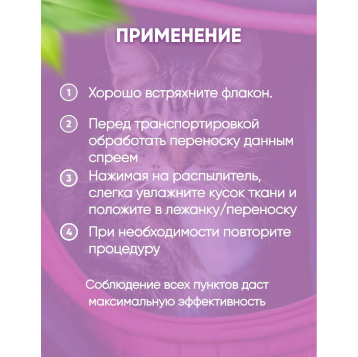 Хорошо встряхните флакон со спрей-корректором «ДокторZOO». Нажимая 3-4 раза на распылитель, слегка увлажните те места, где кошка почувствовала беспокойство. Можно нанести средство на кусочек ткани и положить его в лежанки и домики, которые любит животное. Перед транспортировкой необходимо обработать переноску. На выставках рекомендуется обработать изделия из ткани внутри клетки. Обработанные места должны быть хорошо доступны для кошки, т.к. она будет их обнюхивать При необходимости повторите процедуру.