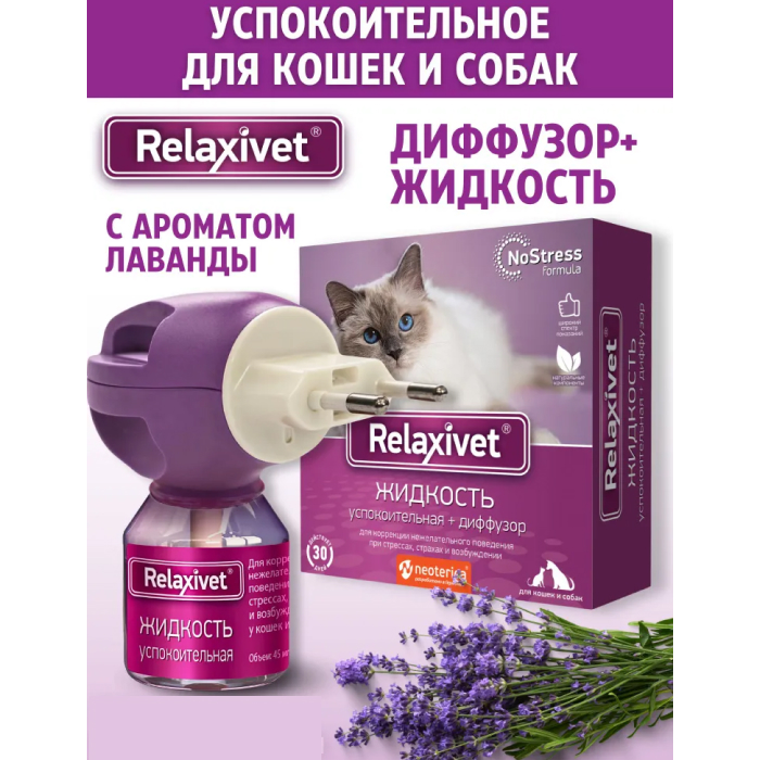 Комплект из успокоительной жидкости и электрического диффузора Relaxivet обеспечивает целый месяц спокойствия для всех: