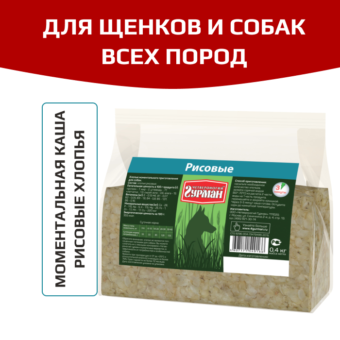 Четвероногий гурман Моментальные каши для собак – это злаковые хлопья или вермишель, которые являются бесценным источником углеводов и необходимым элементом полноценного рациона собаки. Обработанные особым способом злаки сохраняют все полезные вещества и позволяют за считанные минуты приготовить вкусный и натуральный обед. Моментальные каши не требуют варки: злаки или вермишель необходимо залить горячей водой и дать настояться – через 5 минут гарнир для полноценного обеда готов.