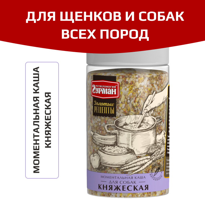 Четвероногий гурман “Золотые рецепты” для собак – это каши моментального приготовления суперпремиум-класса. Они сделаны из злаковых хлопьев, которые являются бесценным источником углеводов и необходимым элементом полноценного рациона собаки. “Золотые рецепты” разработаны на основе традиционных русских блюд и отличаются многокомпонентным составом, в который входят злаки, овощи, фрукты, зелень и морские водоросли. Все рецептуры разработаны специально под потребности собак, и каждый вид каши имеет свои полезные свойства и функциональную направленность.Самостоятельное приготовление такой каши отнимает массу времени, а “Золотые рецепты” будут готовы через 5 минут. Каши не требуют варки – сухие хлопья необходимо залить горячей водой и дать настояться - через 5 минут гарнир для полноценного обеда готов.