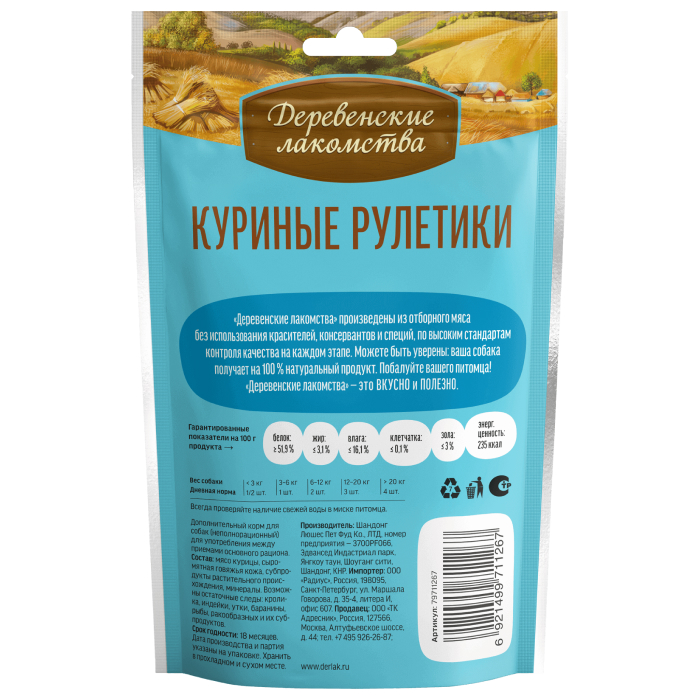 Деревенские лакомства - это серия уникальных лакомств для собак и кошек. В составе продукта 100% мясо, специально нарезанное и запеченое в печи. В каждой пачке содержатся все необходимые питомцу витамины, минералы и микроэлементы.