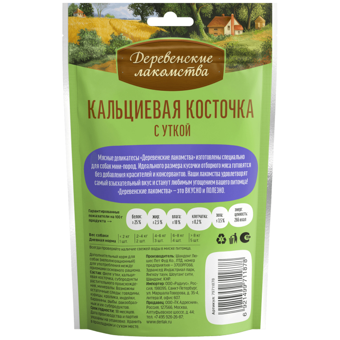 Деревенские лакомства - это серия уникальных лакомств для собак и кошек. В составе продукта 100% мясо, специально нарезанное и запеченое в печи. В каждой пачке содержатся все необходимые питомцу витамины, минералы и микроэлементы.