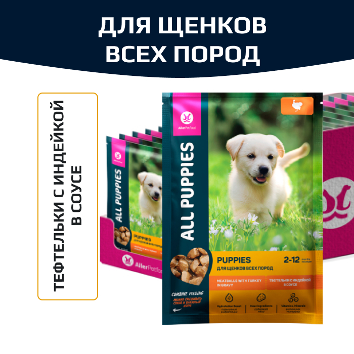 Консервированный премиальный корм ALL PUPPIES для щенков подходит для кормления щенков всех пород, а также для беременных и кормящих собак. Он разработан на основе результатов последних исследований в области питания домашних животных, а также с учетом международных стандартов (AAFCO/FEDIAF). Паучи ALL PUPPIES «Тефтельки с индейкой в соусе» идеально подходят в качестве полноценного питания для щенков. Уровень содержания белков и жиров в сочетание с оптимальным количеством витаминов и минеральных веществ гарантирует сбалансированное питание, которое помогает обеспечить щенка всем необходимым для стабильного роста и развития.