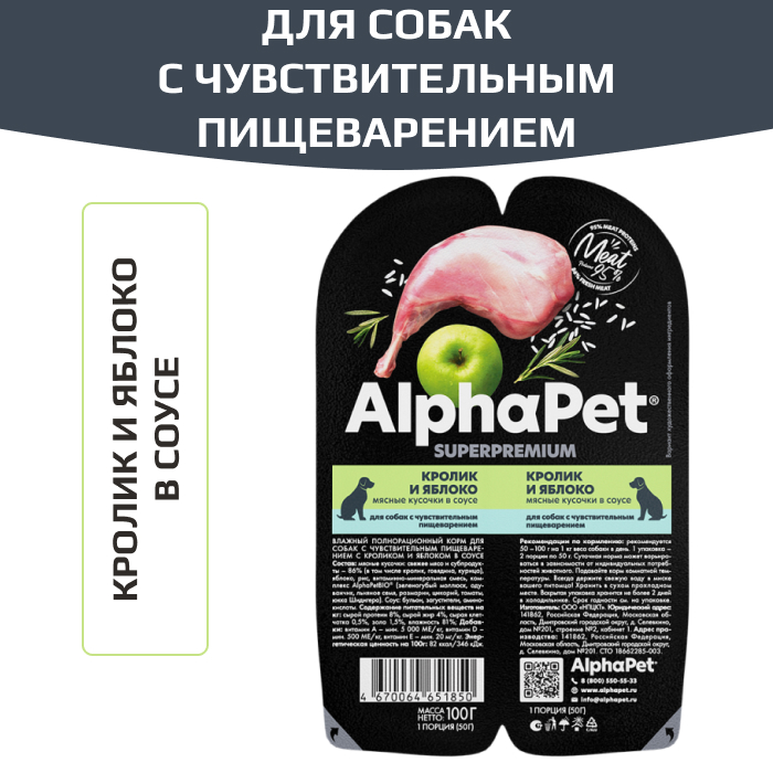 AlphaPet Superpremium / Влажный полнорационный корм для собак с чувствительным пищеварением с кроликом и яблоком в соусе.
