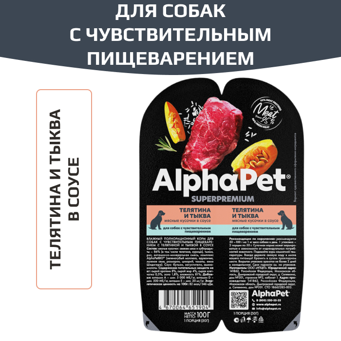AlphaPet Superpremium / Влажный полнорационный корм для собак с чувствительным пищеварением с телятиной и тыквой в соусе.