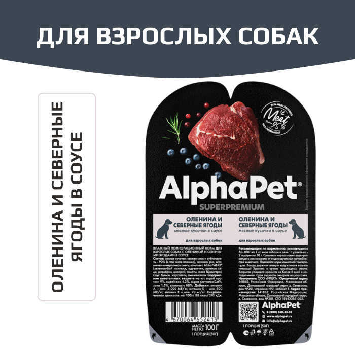 AlphaPet Superpremium влажный полнорационный корм для взрослых собак с олениной и северными ягодами в соусе.