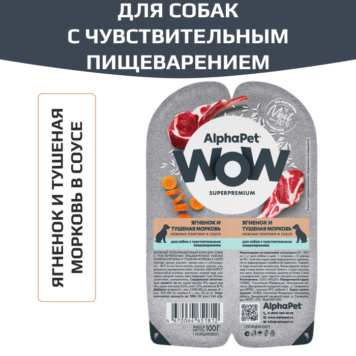 AlphaPet WOW Superpremium / Влажный полнорационный корм для собак с чувствительным пищеварением нежные ломтики ягненка и тушеная морковь в соусе.