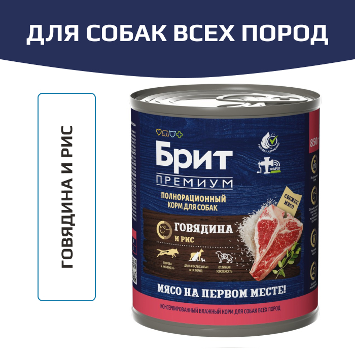 Полнорационный влажный консервированный корм премиум-класса с мясом говядины и рисом для собак всех пород.