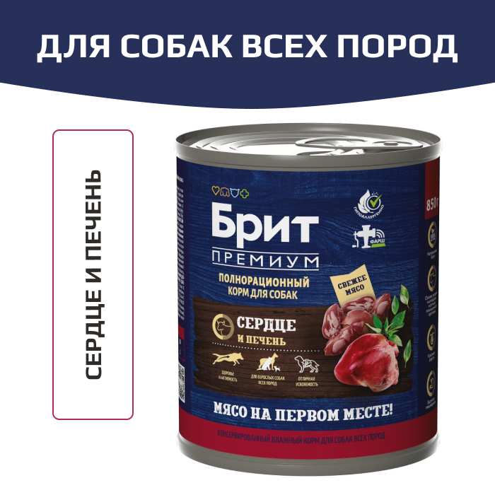 Полнорационный влажный консервированный корм премиум-класса с сердцем и печенью для собак всех пород.
