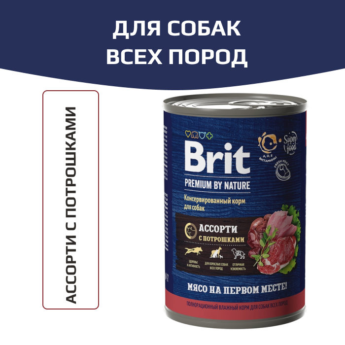 Brit Premium By Nature корм консервированный для собак всех пород, с мясным ассорти с потрошками.